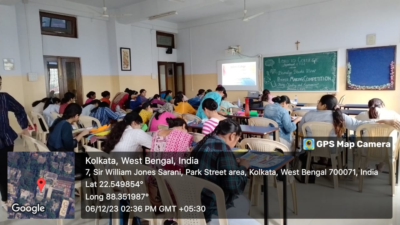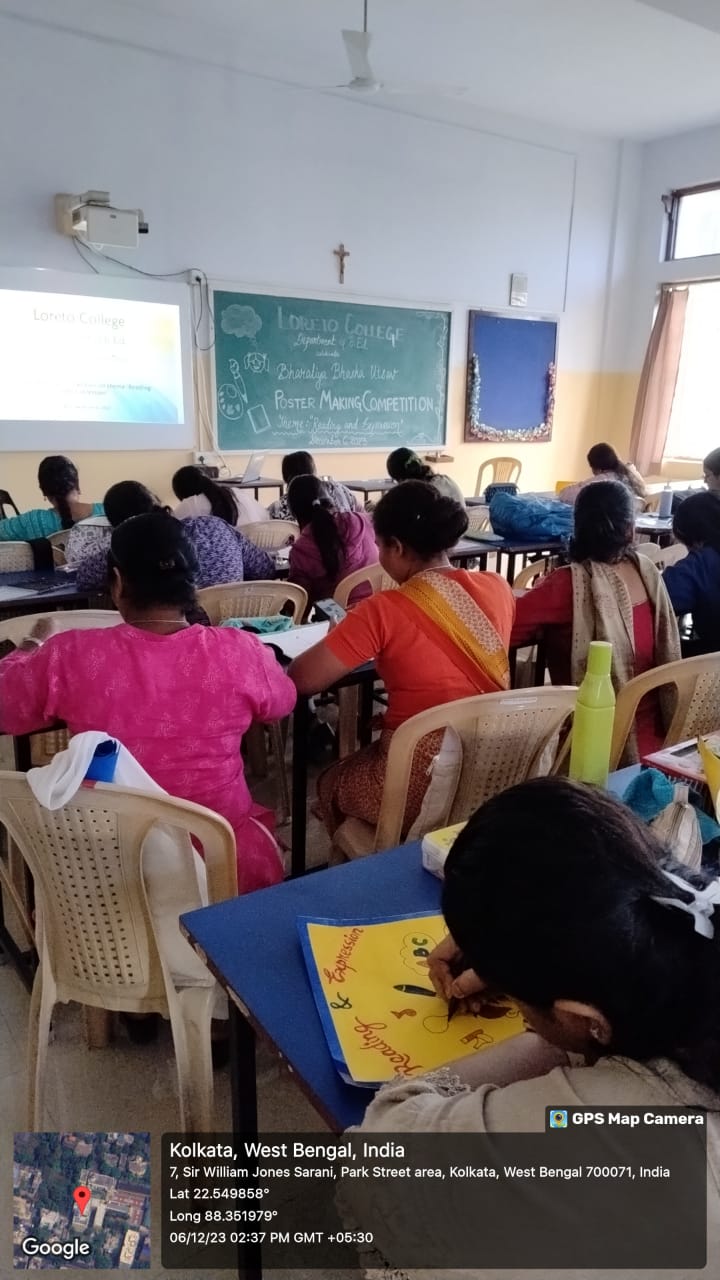 On December 6, 2023, the Semester I trainee students of the Department of B.Ed., Loreto College, Kolkata enthusiastically celebrated Bharatiya Bhasha Utsav through a captivating poster-making competition centred around the theme ‘Reading and Expression.’ The event showcased the students’ artistic talents and creativity as they visually conveyed the importance of reading and its impact on self-expression. Mehwish Ali Ahmed secured the first position, while Sambika Ghosh and Neha Hossain secured the second and third positions respectively. The posters reflected a deep appreciation for the power of language and the transformative role of literature in shaping ideas and perspectives. The competition was a resounding success, fostering a sense of pride in linguistic diversity and promoting the joy of reading within the student community.