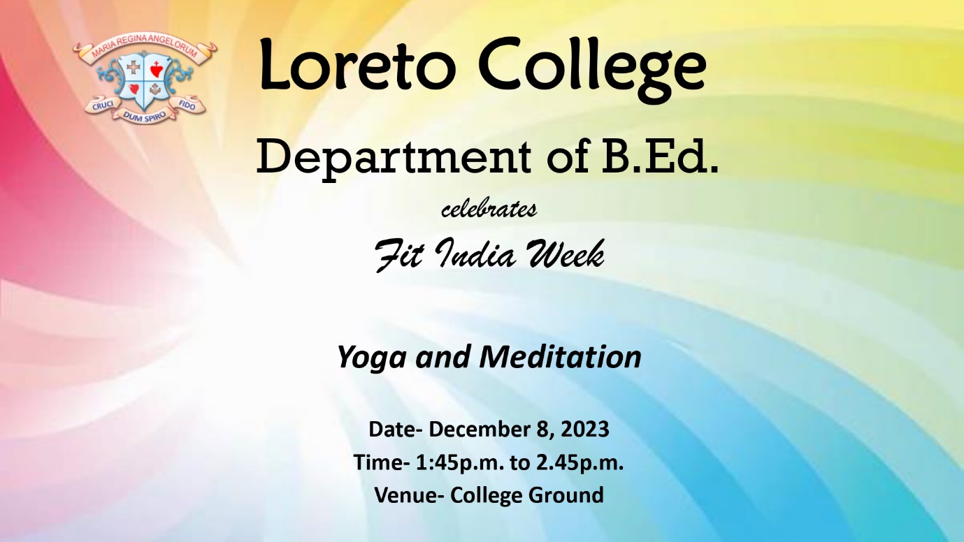 On December 8, 2023, the Department of B.Ed. at Loreto College, Kolkata celebrated Fit India Week by conducting a rejuvenating yoga and meditation session. The session encompassed a variety of yoga postures, including sitting, standing, and lying positions. It aimed to promote physical well-being and mental tranquility among the participants. The event provided a holistic approach to fitness, emphasizing the importance of flexibility, strength, and inner calm. Trainees from Semesters I and III actively participated in the session, embracing the principles of yoga and meditation for overall health and wellness.