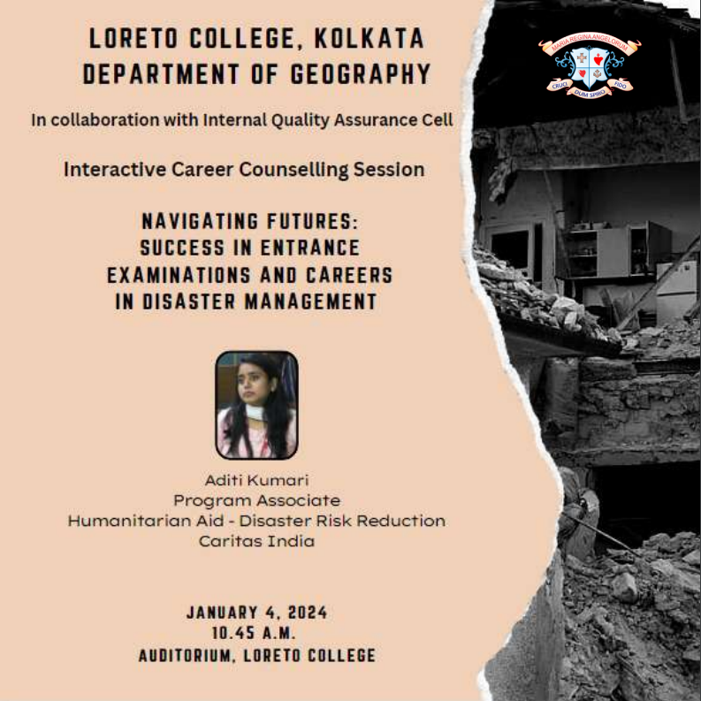 The Department of Geography, Loreto College, Kolkata organised an Interactive Career Counselling Session on “Navigating Futures: Success in Entrance Examinations and Careers in Disaster Management” in collaboration with the Internal Quality Assurance Cell (IQAC) on January 4, 2024.