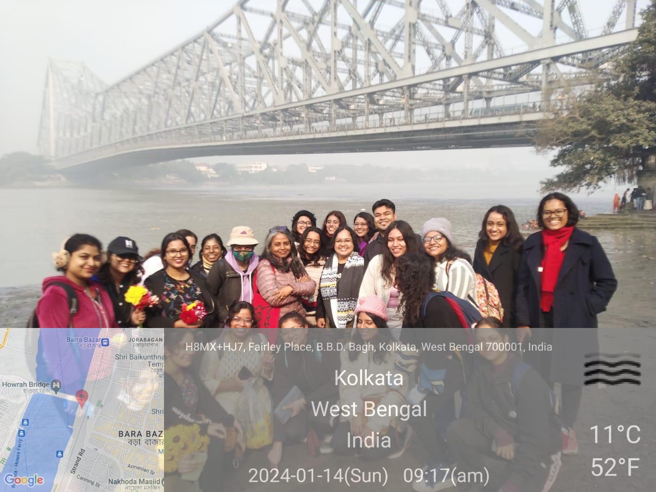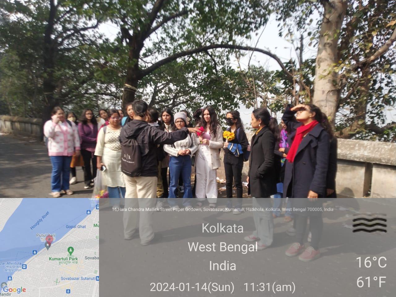 Kolkata has always been a city with immense historical and cultural significance, with every nook and cranny being a reservoir of tales from days bygone. The UG Semester V and PG Semester I students of the Department of English, Loreto College, Kolkata set out to explore such tales related to the city’s water heritage through an excursion entitled “Exploring the Goddess on Earth.” This walking tour of the ghats of Ganga was organised in collaboration with the Living Waters Museum and conducted by Mr. Sukrit Sen on January 14, 2024. The students were accompanied by their teachers Dr. Sukanya Dasgupta, Dr. Sanghita Sanyal, Dr. Subhasree Basu, and Mr. Somnath Basu.