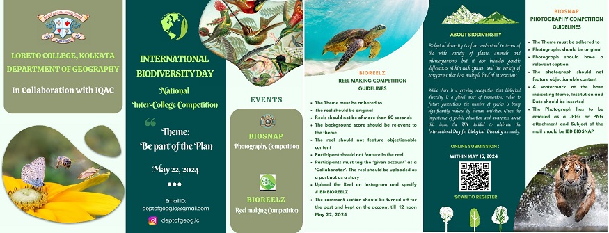 The Department of Geography, Loreto College, Kolkata, in collaboration with the Internal Quality Assurance Cell (IQAC), organised a National Inter-College Photography and Reel Making Competition to commemorateInternational Biodiversity Day, observed on May 22, 2024.