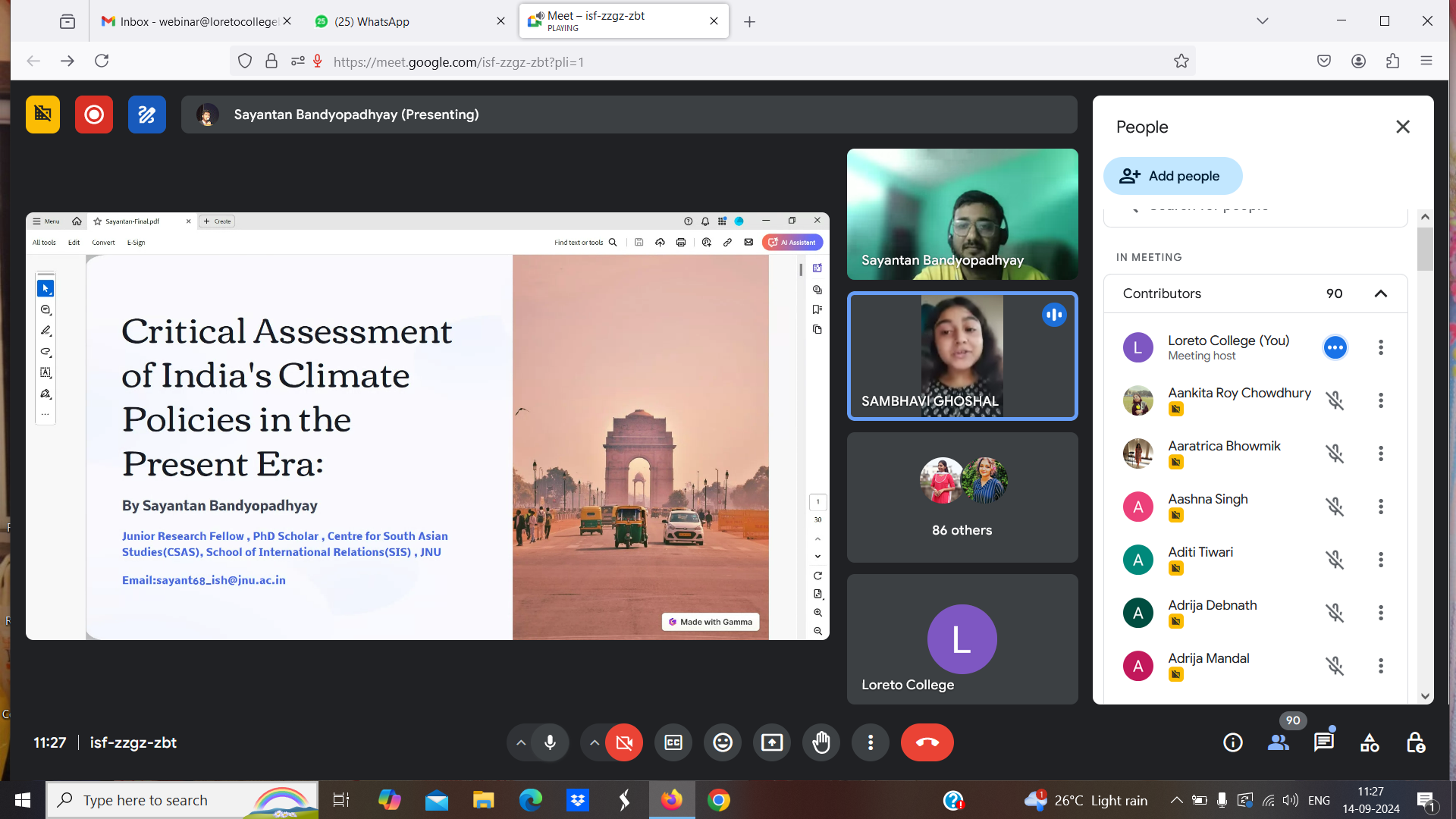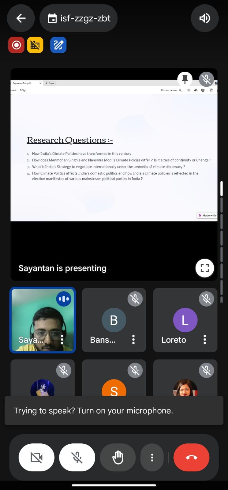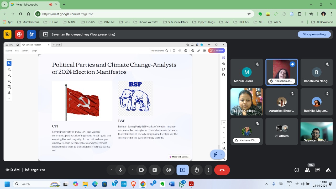 On September 14, 2024, the Department of Political Science at Loreto College, Kolkata organised a special online lecture on India’s Climate Policy: Critical Assessment of the Climate Policies in Present Era. The lecture, which was delivered by Mr. Sayantan Bandopadhyay, a PhD scholar at Jawaharlal Nehru University, Delhi, focused on four key areas: the evolution of India’s climate policies and their growing relevance in contemporary times; a comparative analysis of the climate policies of Prime Minister Narendra Modi and former Prime Minister Manmohan Singh; the impact of climate policies on India’s domestic politics; and India’s international climate diplomacy strategies and how these policies are reflected in the election manifestos of various political parties. The lecture was followed by a dynamic interactive session, during which Mr. Bandopadhyay addressed queries with clarity. The session was attended by 118 participants, who gained valuable insights into India’s climate policy framework.