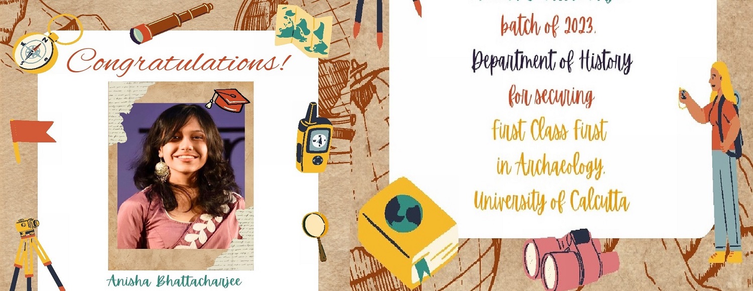 • Congratulations Anisha Bhattacharjee (Batch of 2023, Department of History) for securing First Class First in Archaeology, University of Calcutta